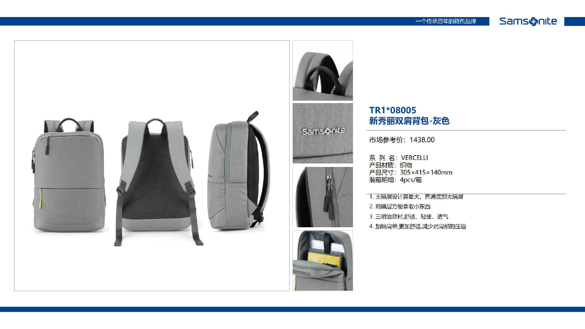 1. 主隔层设计容量大,直通底部大隔层 2. 前隔层方便拿取小东西 3. 三明治背衬,舒适、轻便、透气 4. 加棉肩带
