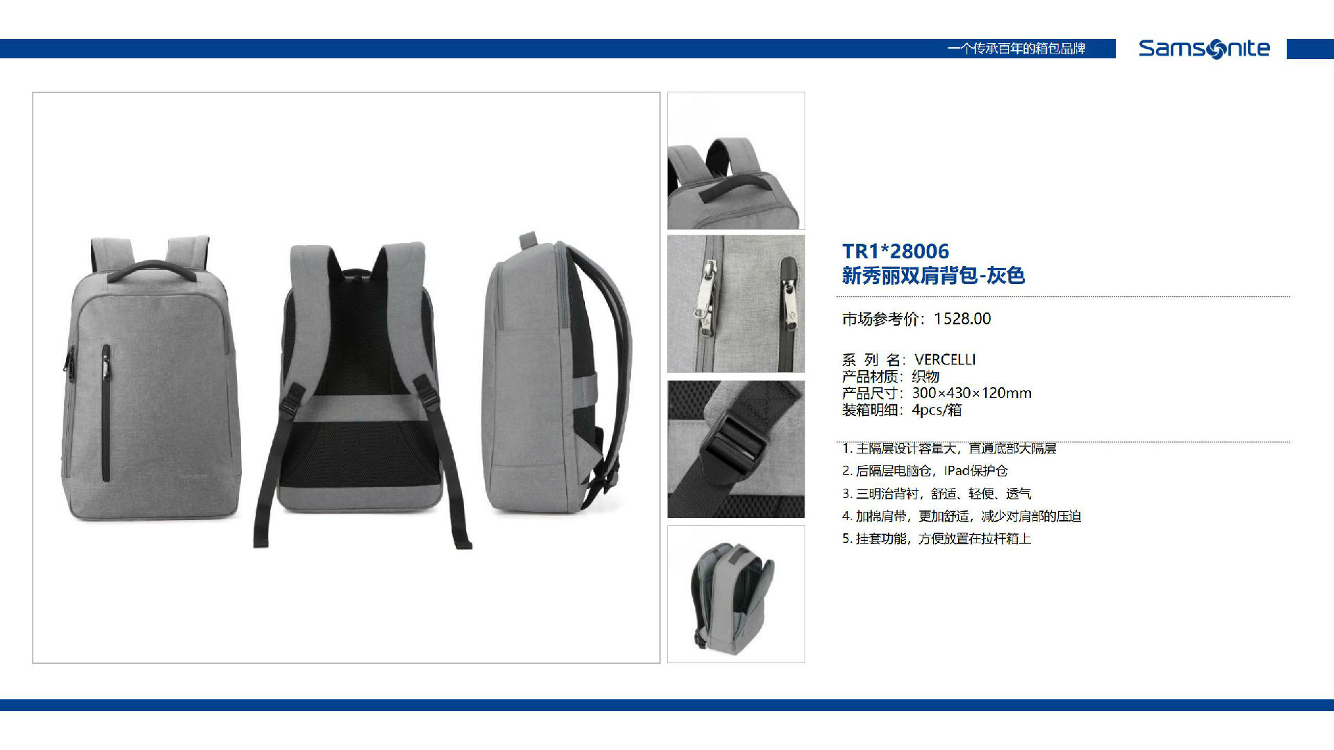 商品名称:新秀丽双肩背包-灰色