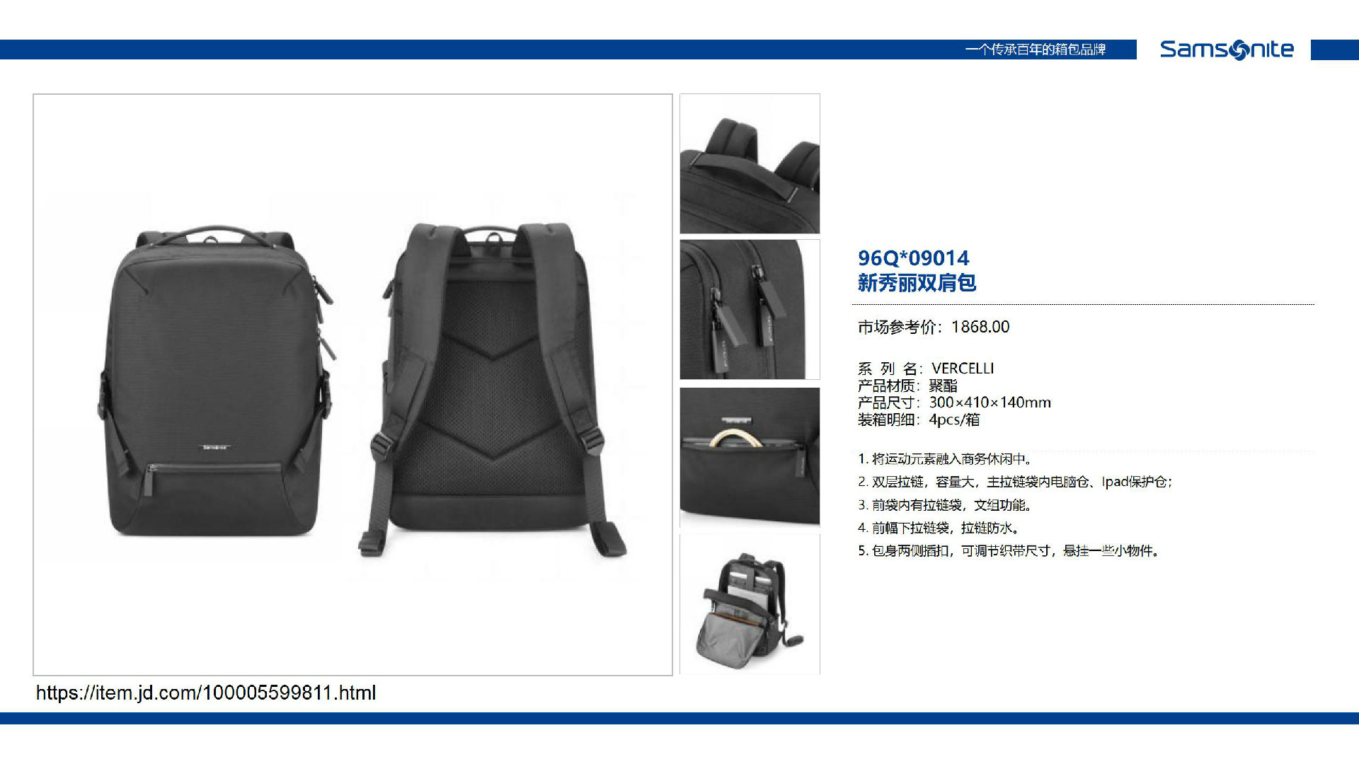 1. 将运动元素融入商务休闲中。 2. 双层拉链,容量大,主拉链袋内电脑仓、Ipad保护仓; 3. 前袋内有拉链袋