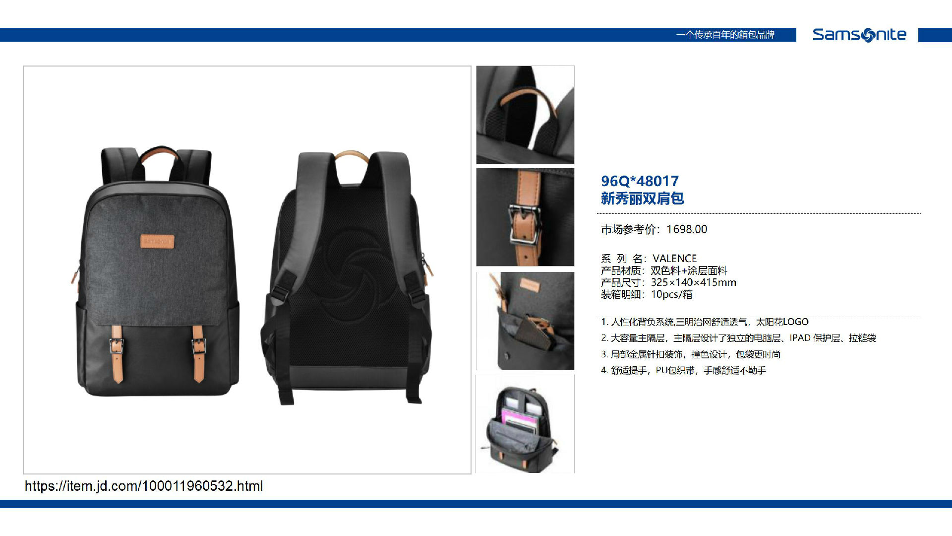 1. 人性化背负系统,三明治网舒适透气,太阳花LOGO 2. 大容量主隔层,主隔层设计了独立的电脑层、IPAD 保护层
