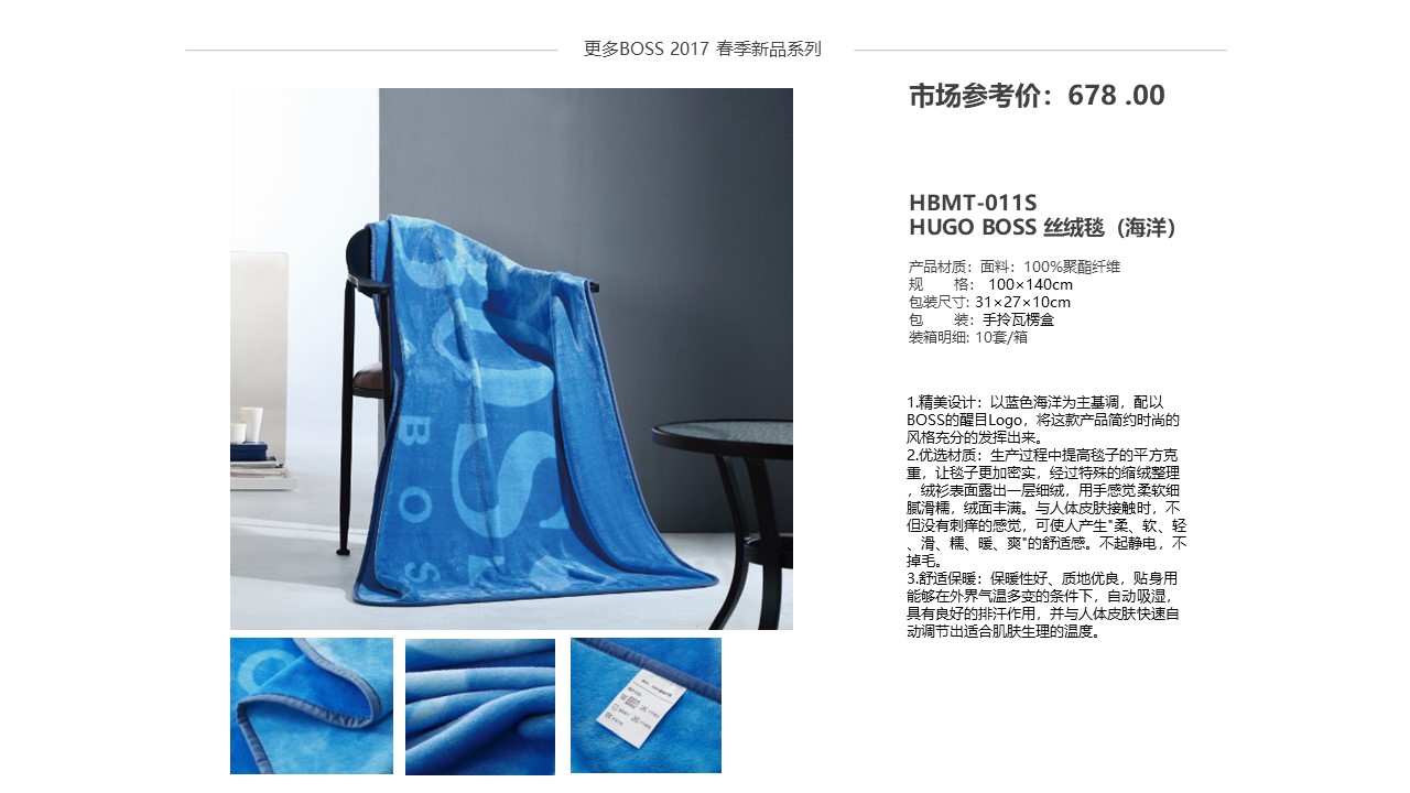 商品名称:HBMT-011S HUGO BOSS 丝绒毯(海洋)