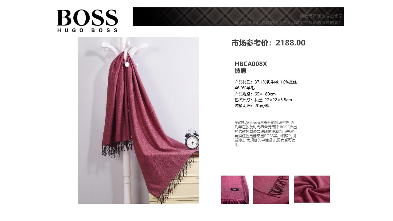 羊驼毛(Alpaca)与蚕丝的混纺材质,近几年在欧美时尚界备受青睐.BOSS推出的这款披肩便是跟随这股潮流而来