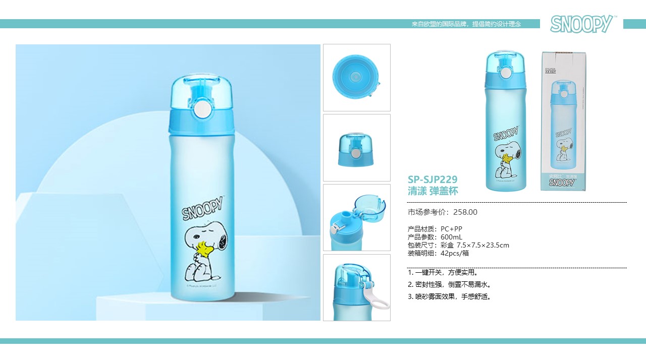 1. 一键开关,方便实用。 2. 密封性强,倒置不易漏水。 3. 喷砂雾面效果,手感舒适。
