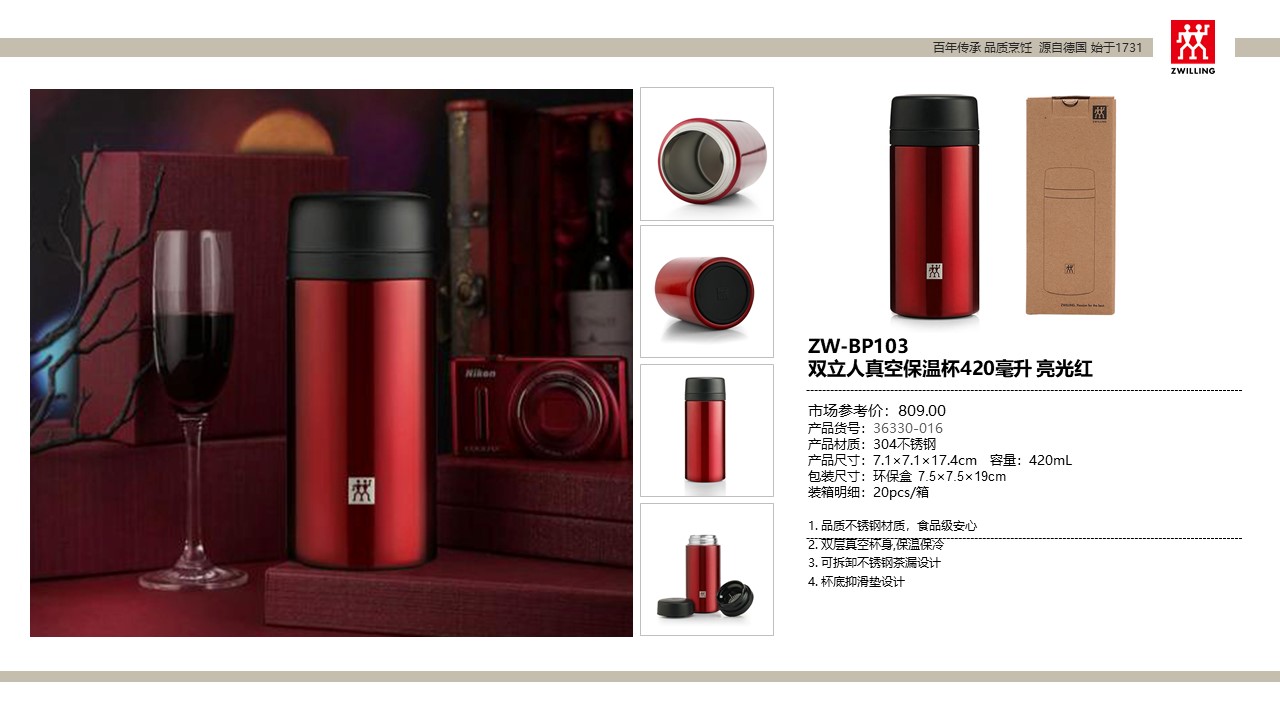 商品名称:ZW-BP103 双立人真空保温杯420毫升 亮光红