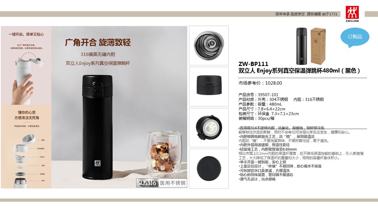 ZW-BP108 双立人 Enjoy系列真空保温茶滤杯480ml(黑色)